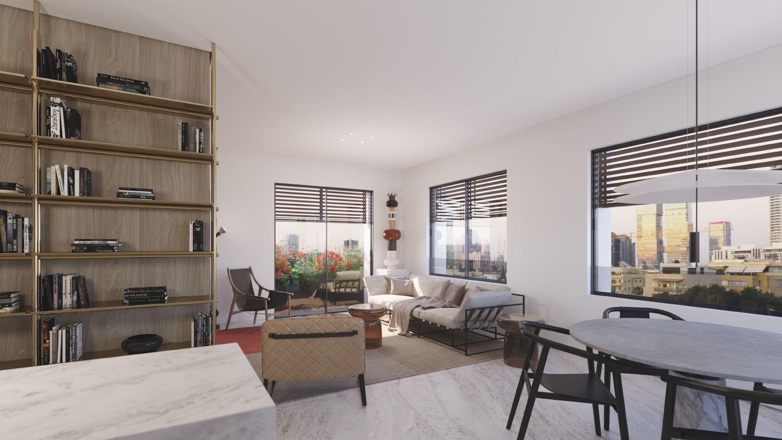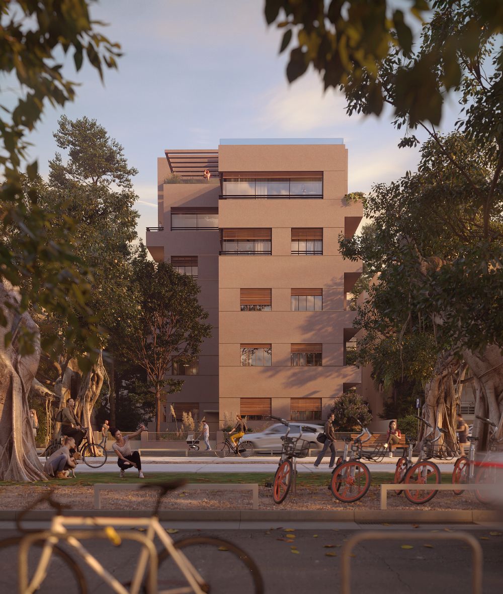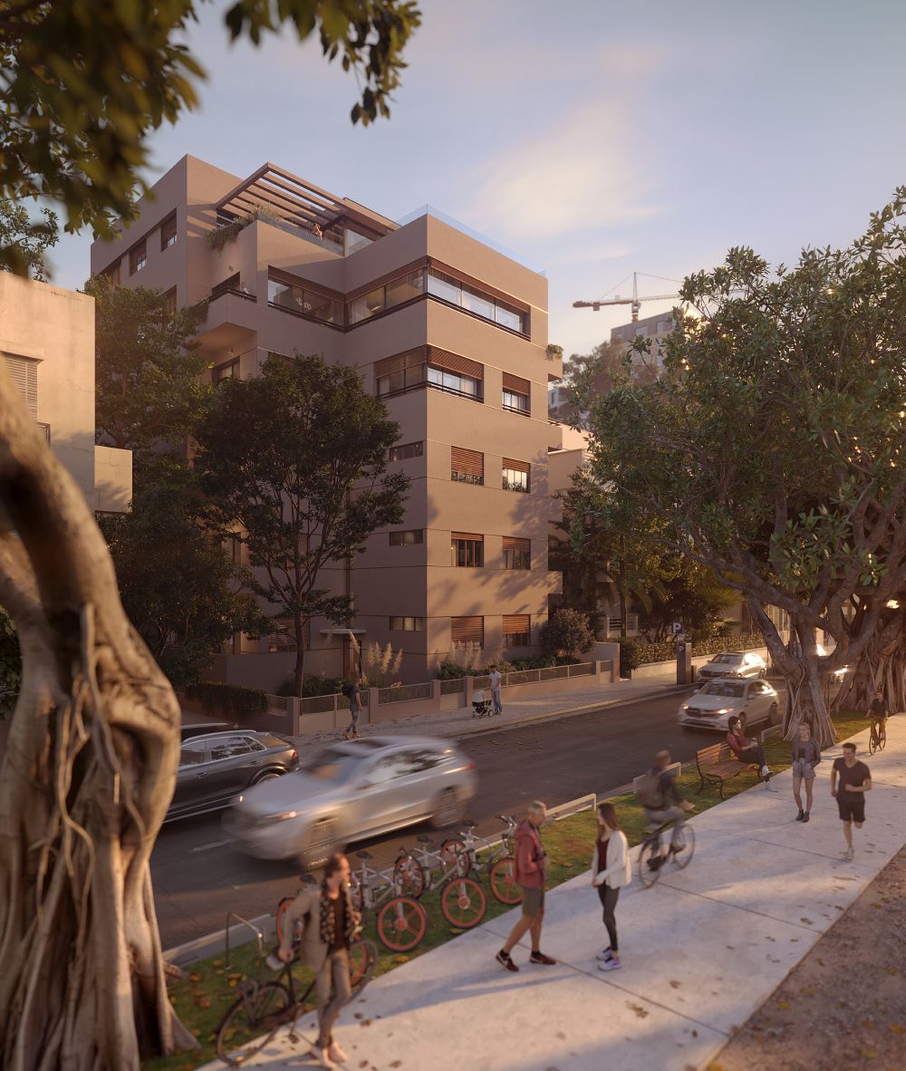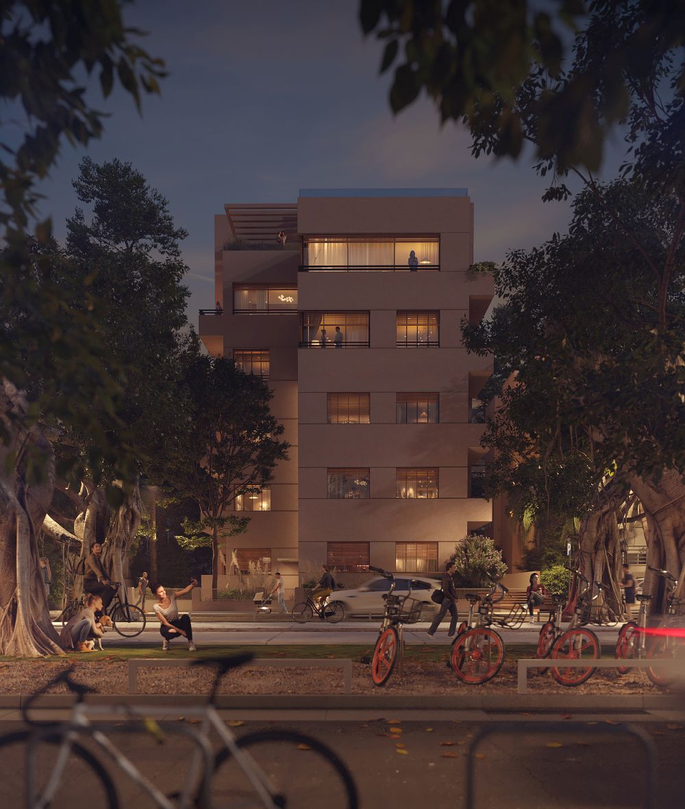 Architectural visualization of residential building located in Rothschild St. Tel Aviv. The visualization provides a detailed look at the building's exterior and interior, including its various features, architectural design, and layout.