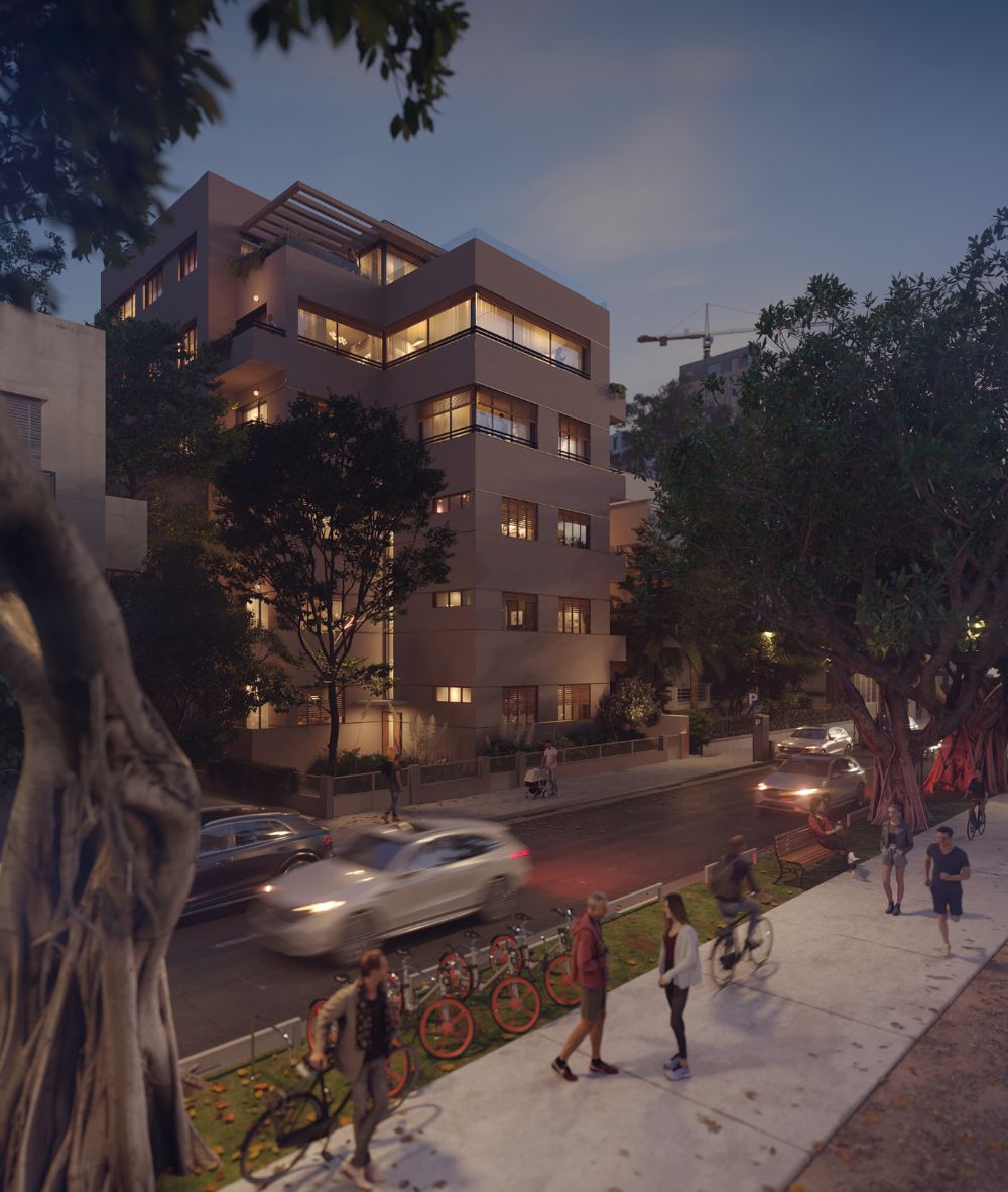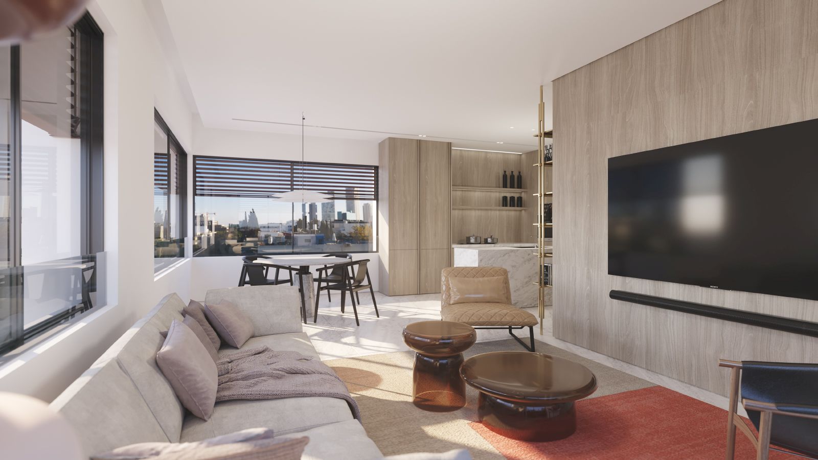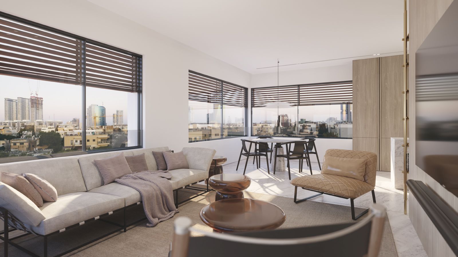 Architectural visualization of residential building located in Rothschild St. Tel Aviv. The visualization provides a detailed look at the building's exterior and interior, including its various features, architectural design, and layout.