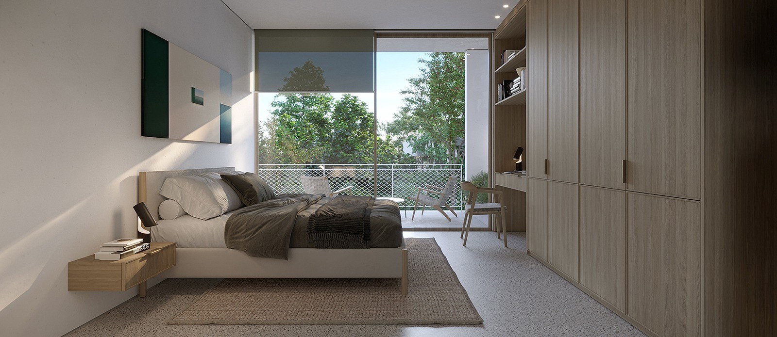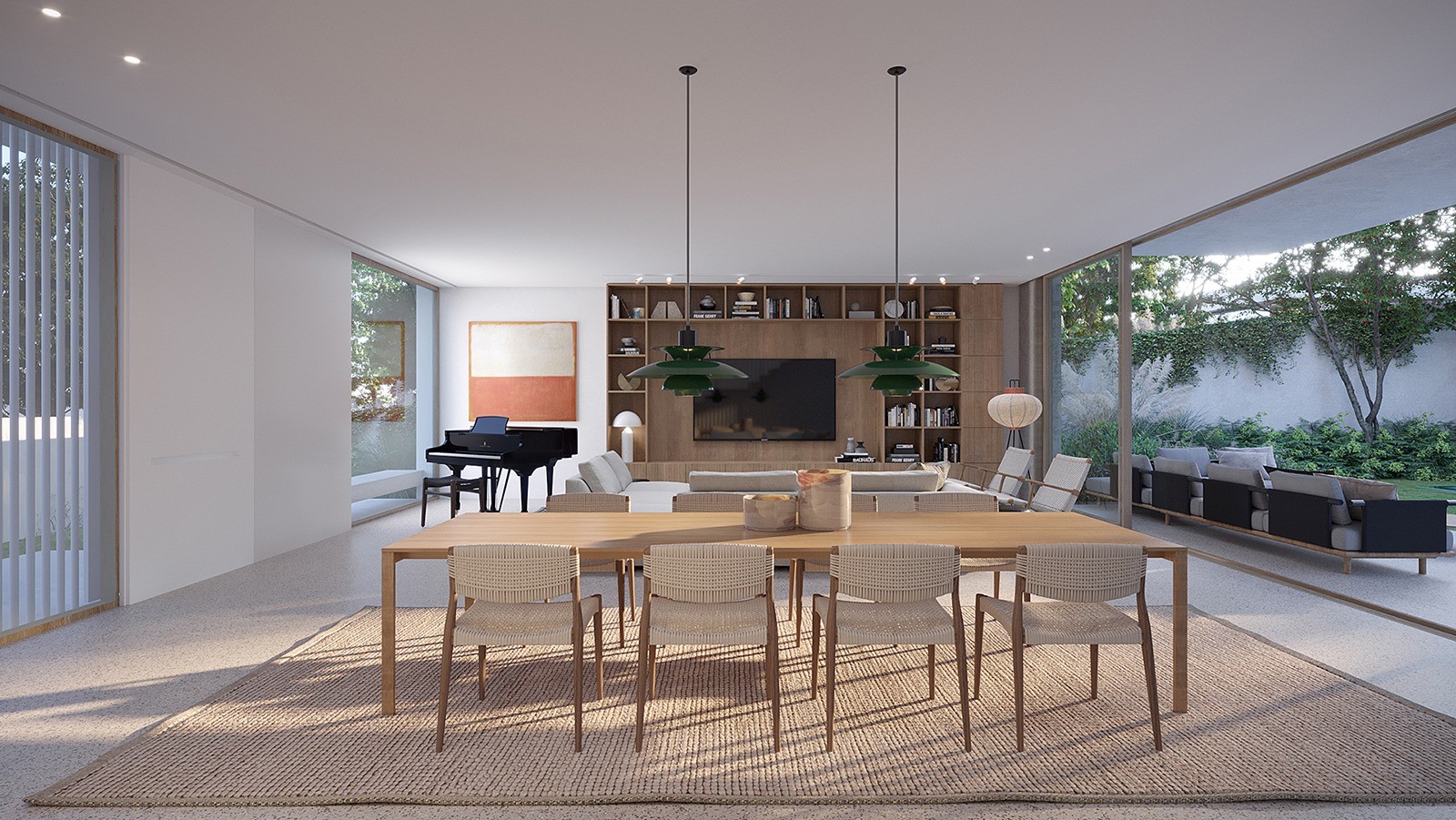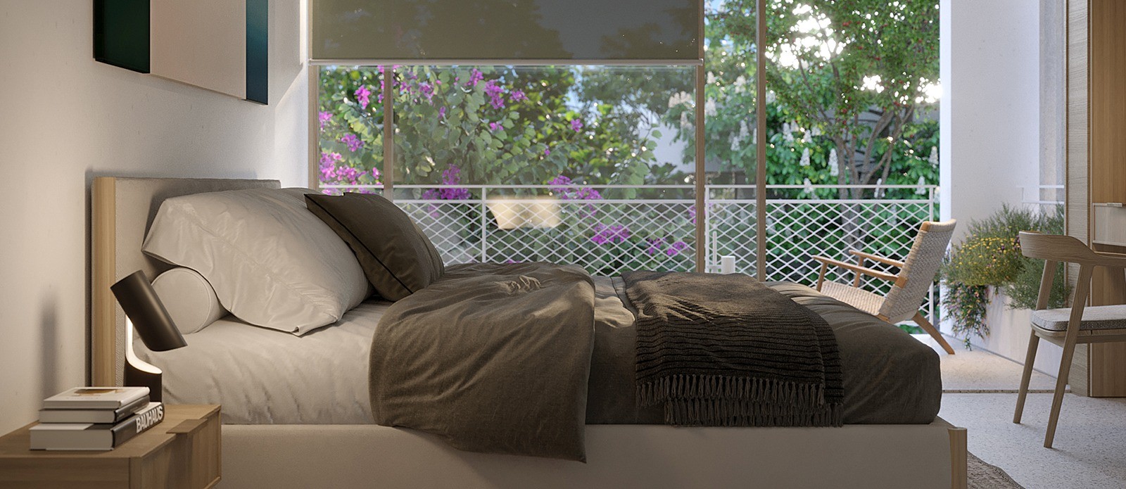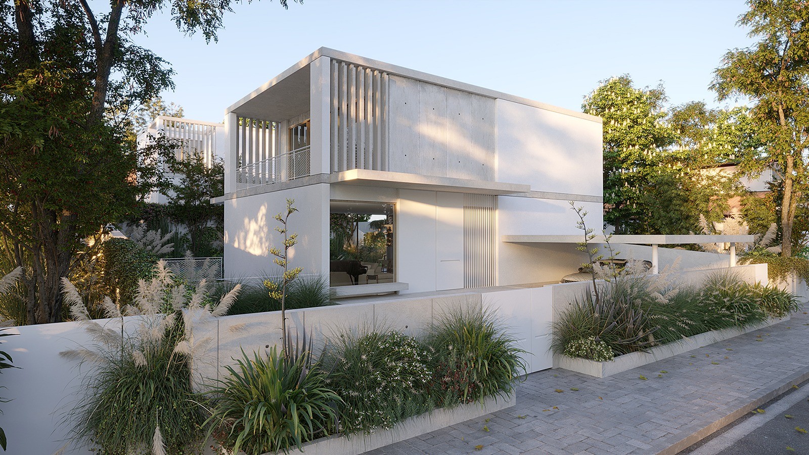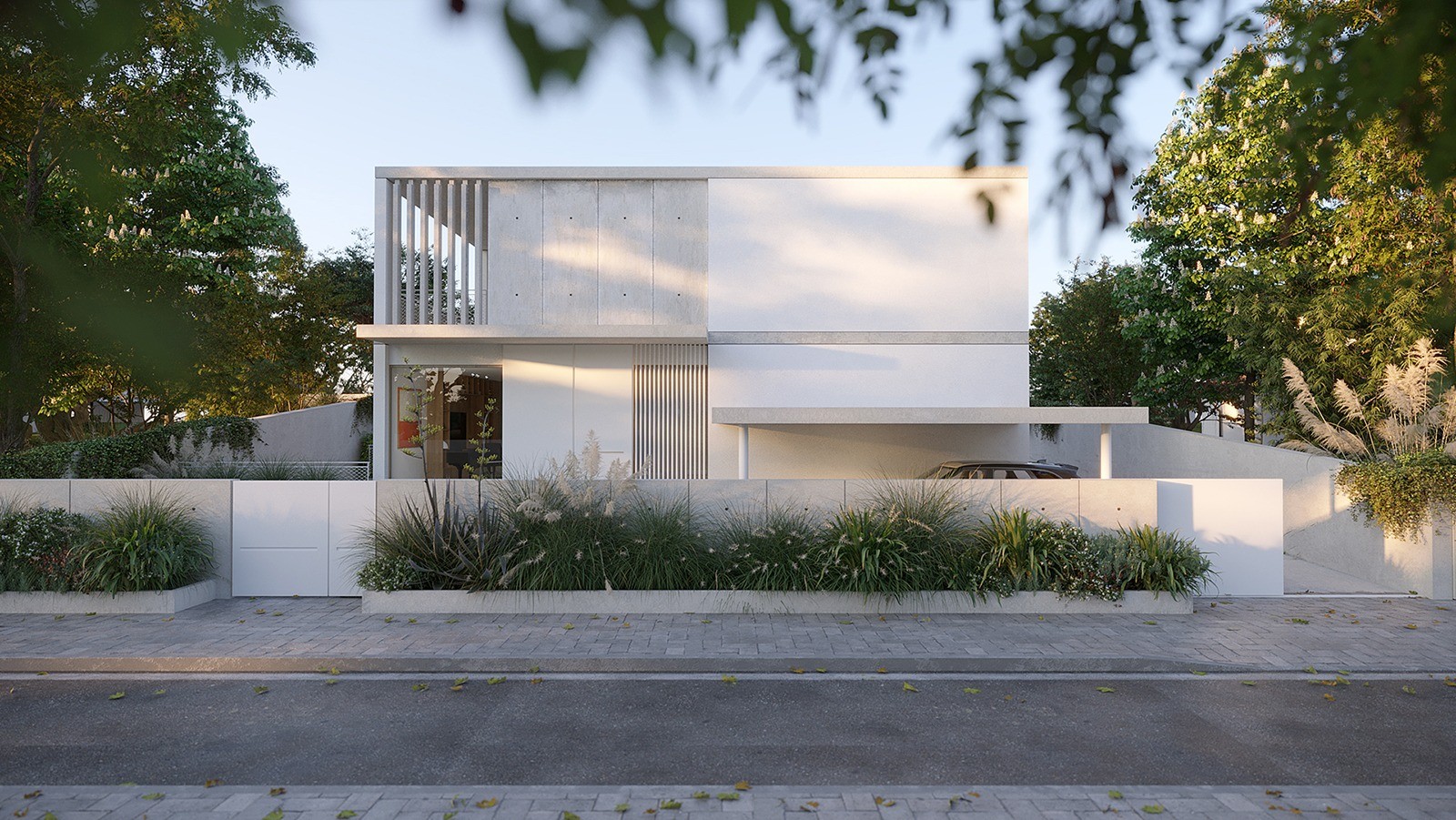 A 3D visualization for a house in Kfar Shmaryahu. It is a modern, minimalist two-story house with light-colored concrete and glass. The front features a low fence with lush greenery. The property is surrounded by mature trees and plants, creating a private and tranquil setting.