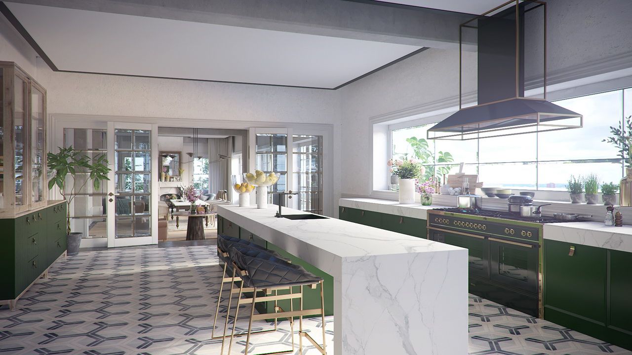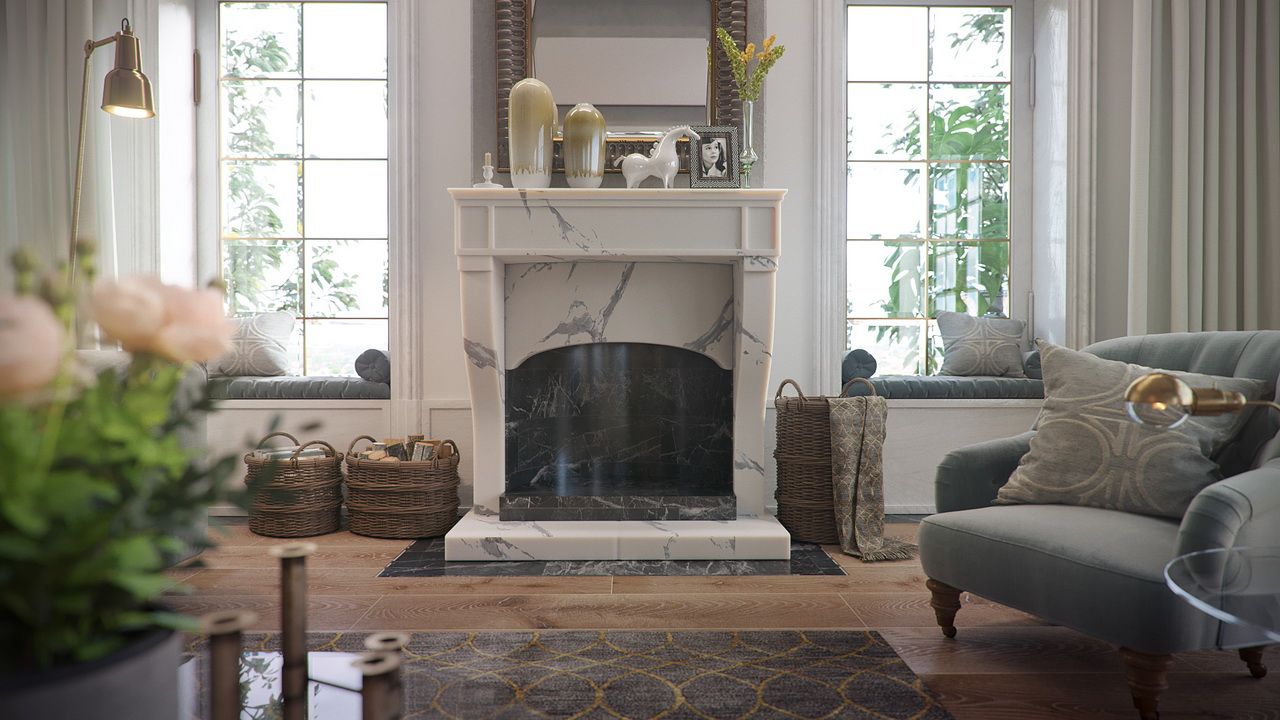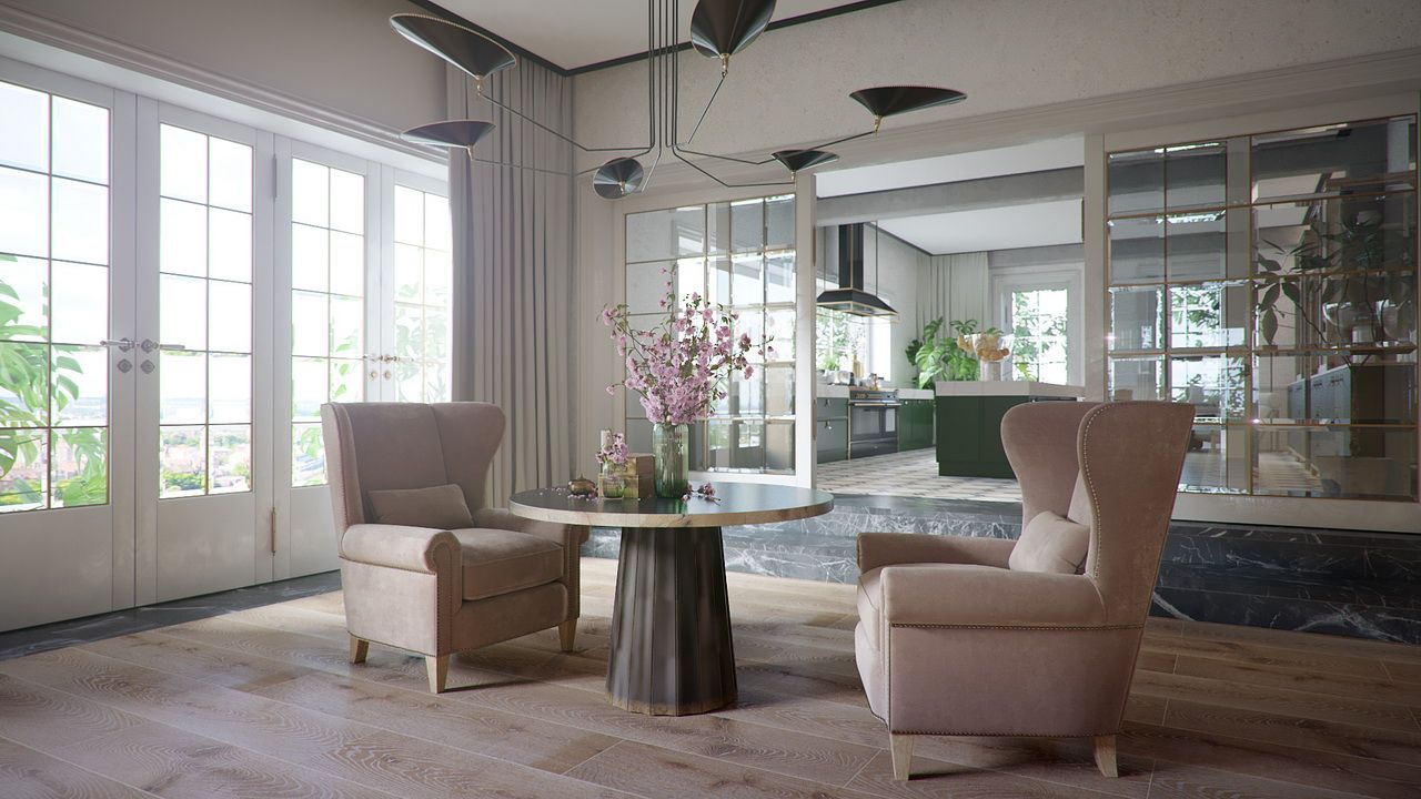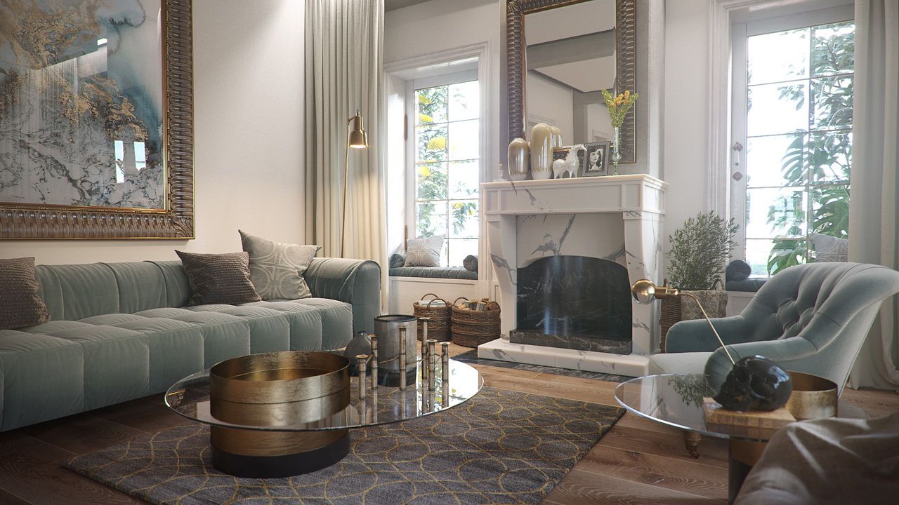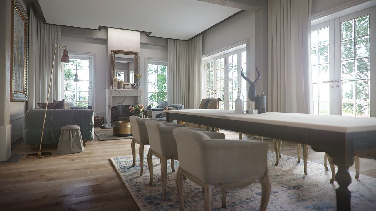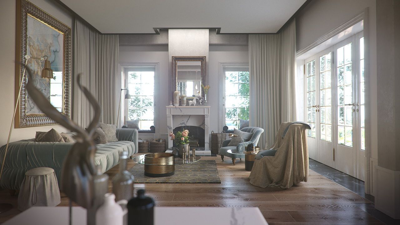 An interior visualization of a luxurious and elegant house that incorporates traditional design elements, such as ornate furniture, decorative moldings, and richly colored fabrics.